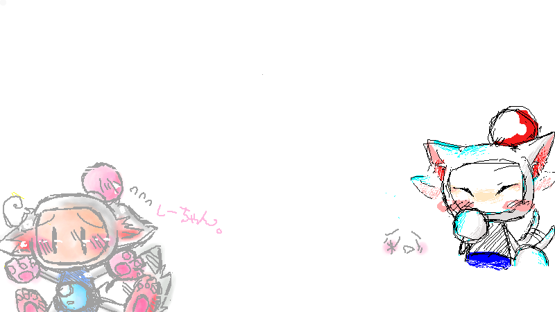 確かボンバーマンだと思う(昔だから記憶が曖昧)白ちゃんです。ケモ耳+尻尾っという萌え要素^^ 小さい頃に数回っというか1~2回位しか描いたことが無いに近いので、モーグリを描いてる気分でした(赤玉と笑顔という吊目)頬が赤くなってるから、とても可愛い///