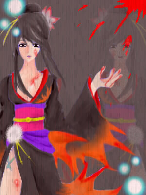 BASARAから濃姫で挑戦しました。この人描いたの始めてだから資料見あさってました。右の濃姫が笑っている様に見えたら幸いです。後、右上の血は案外気に入ってます。