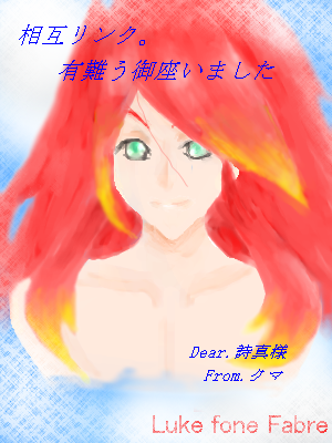この絵は、某お絵かき掲示板に投稿したものです。リアルを追求した所、リアルもどきが発生。眼は気に入っています。自分なりに・・・テイルズのリオンですが・・・分かりますかね?肩の穴あきは私の趣味ですかね?(聞くな!)クリックしたら、綺麗に見えると思います。