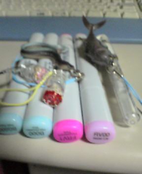 新色ピンクを2本追加~水色は無くなったので補充。上のストラップはガチャで・・・魚のストラップ2個と香炉みたいなストラップ2本をしました~魚は200円と高値^^;