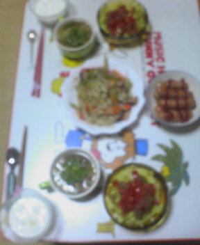 メニューはスープ、サラダ、野菜炒め、ウィンナー、ヨーグルト、トースト、という野菜炒めが違うものだったら完璧洋風の晩飯。旨かったです^^