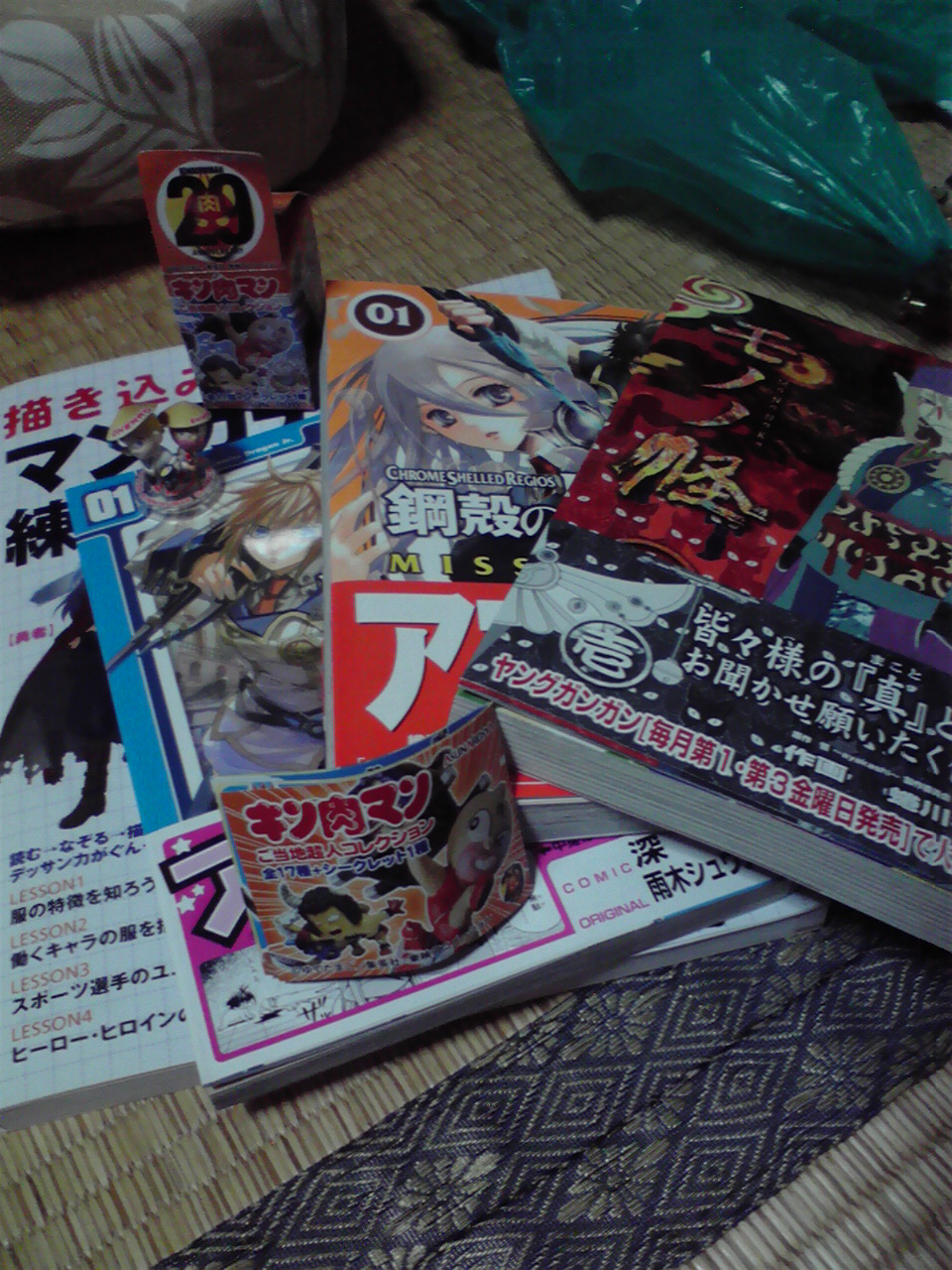 そして今日の収穫は、イラスト系統と漫画系統3冊。見たら・・・分かるかな?大体は分かると思う(一番前の本は直ぐ分かると思う)そしてコンビニよって弁当を買い、キン/肉/マンのご当地シリーズ的なものを購入・・・妹に選ばせるといい物が当たるんだぜ^^v