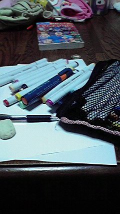 飯を食べる前に一枚撮りました。コピック達と愛用シャーペンと消しゴムとコピー用紙二枚。