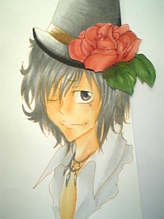 色はコピックで着色。シルクハットの形が変・・・傾いてるよ?右に。薔薇は厚紙に描いてコピックで着色。っていうかコピックしか上手く使えない。水彩も前にちょっとばかり齧ってみました。中々難しいですね^^;