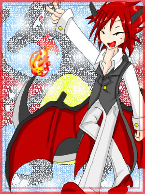 黒い羽と尾は彼のトレードマーク。いつも笑顔だが、真剣になると開眼。色は血の様に赤い真紅。色が他の皆と違うがそれで不満に思ったことは無い。寧ろ「自分は特別」っと言う思考がある。良く大人組みと一緒に酒を飲んでいる所を目撃されている。昔「可愛い」と女性に言われて以来、「可愛い」の単語を聞くと何でも燃やそうとする。